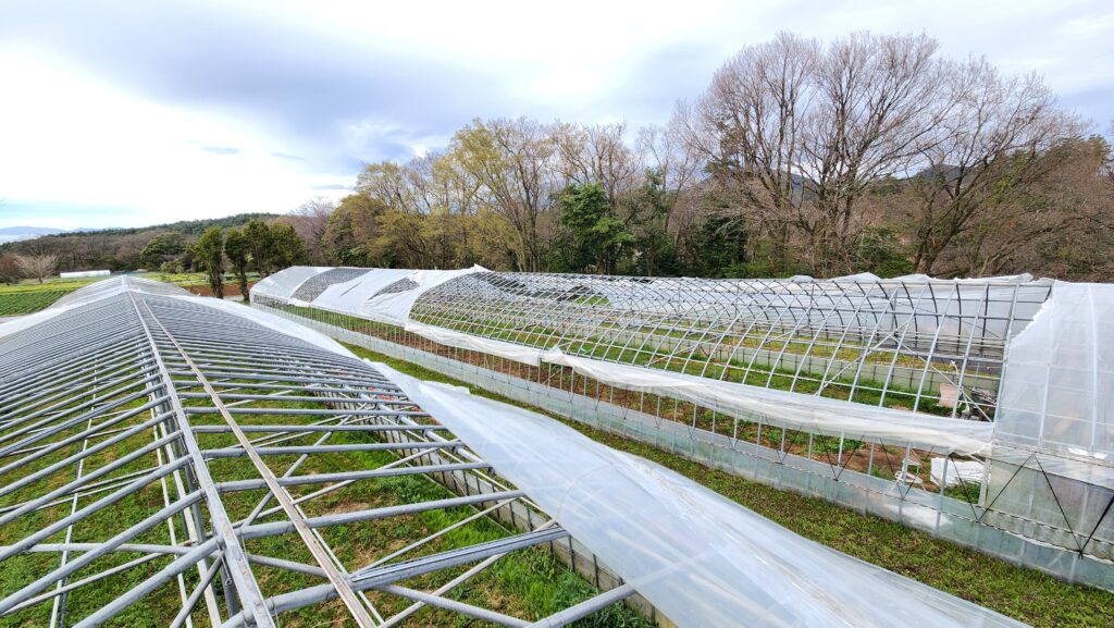 畑に行ってみるとビニールは大きく破れ、骨組みが剥き出し…。改めて、自然の力の大きさを感じました。